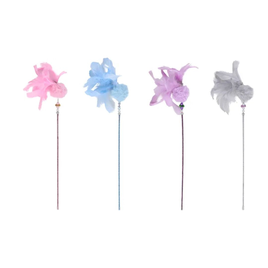 Let your cat have a good old play with the Boefie wand toy with ball! This colourful wand with plush toy will really get your fluffy friend's hunting instincts going. Complete with glitter, a jingling bell, and feathers for extra fun. Let the playtime commence!