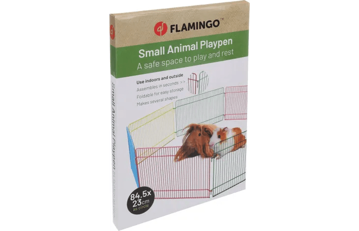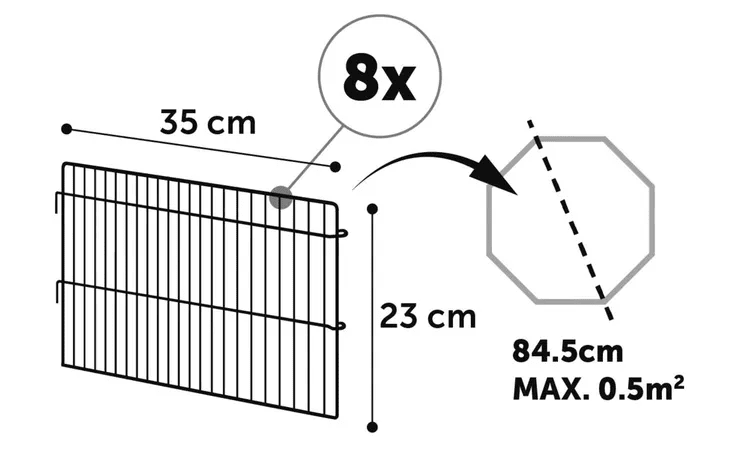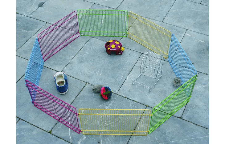 Create a play paradise for your small rodents with this 8-panel run, standing at 23cm tall. It features a front door with a hook fastener and can be assembled in various shapes, perfect for hamsters and mice but not suitable for larger critters.