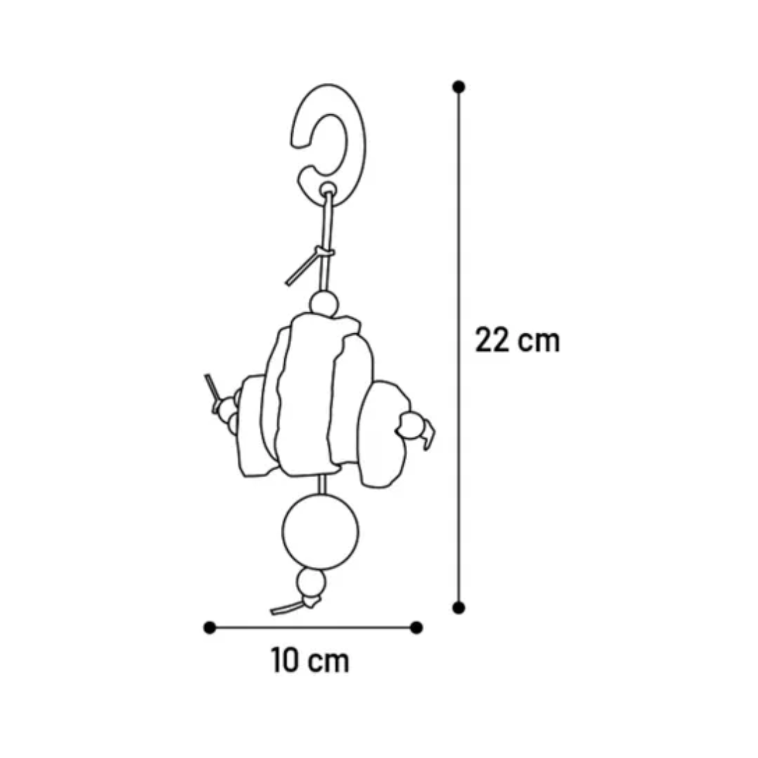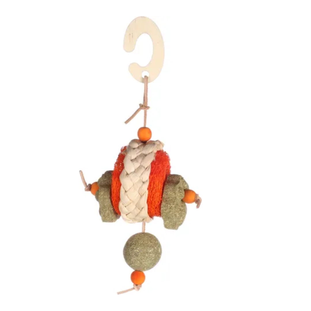 This chew toy is made from natural materials like grass, loofah, corn leaves, leather, and wood. It's perfect for nibbling on and great for teeth. Simply hang it up with the wooden hanging hook.