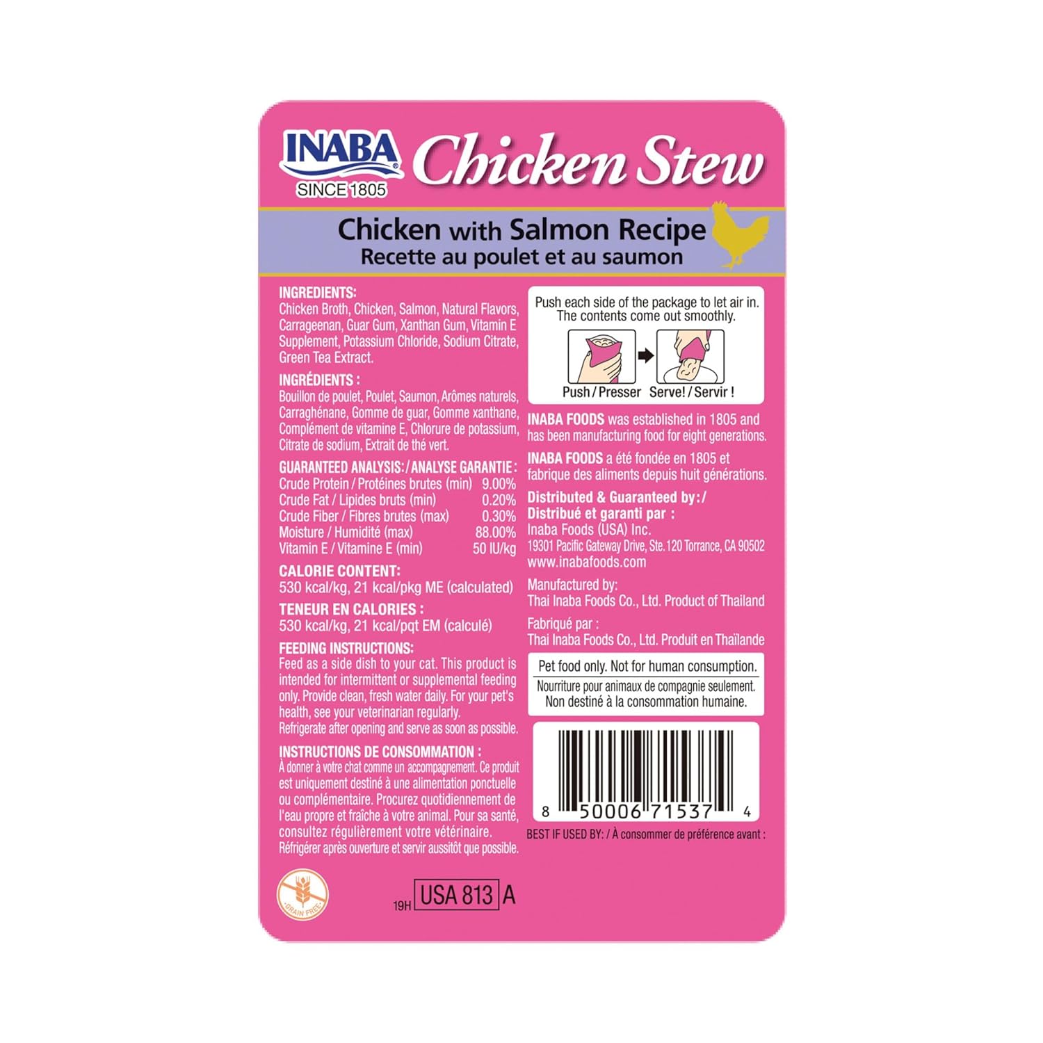 CHICKEN STEW CHICKEN WITH SALMON RECIPE 40G X 6 POUCHES is a multi-pack of wet cat food supplements featuring tender shredded chicken and salmon in a thick gelée sauce. With high moisture content, these grain-free stews provide hydration and are free from artificial colors and preservatives.