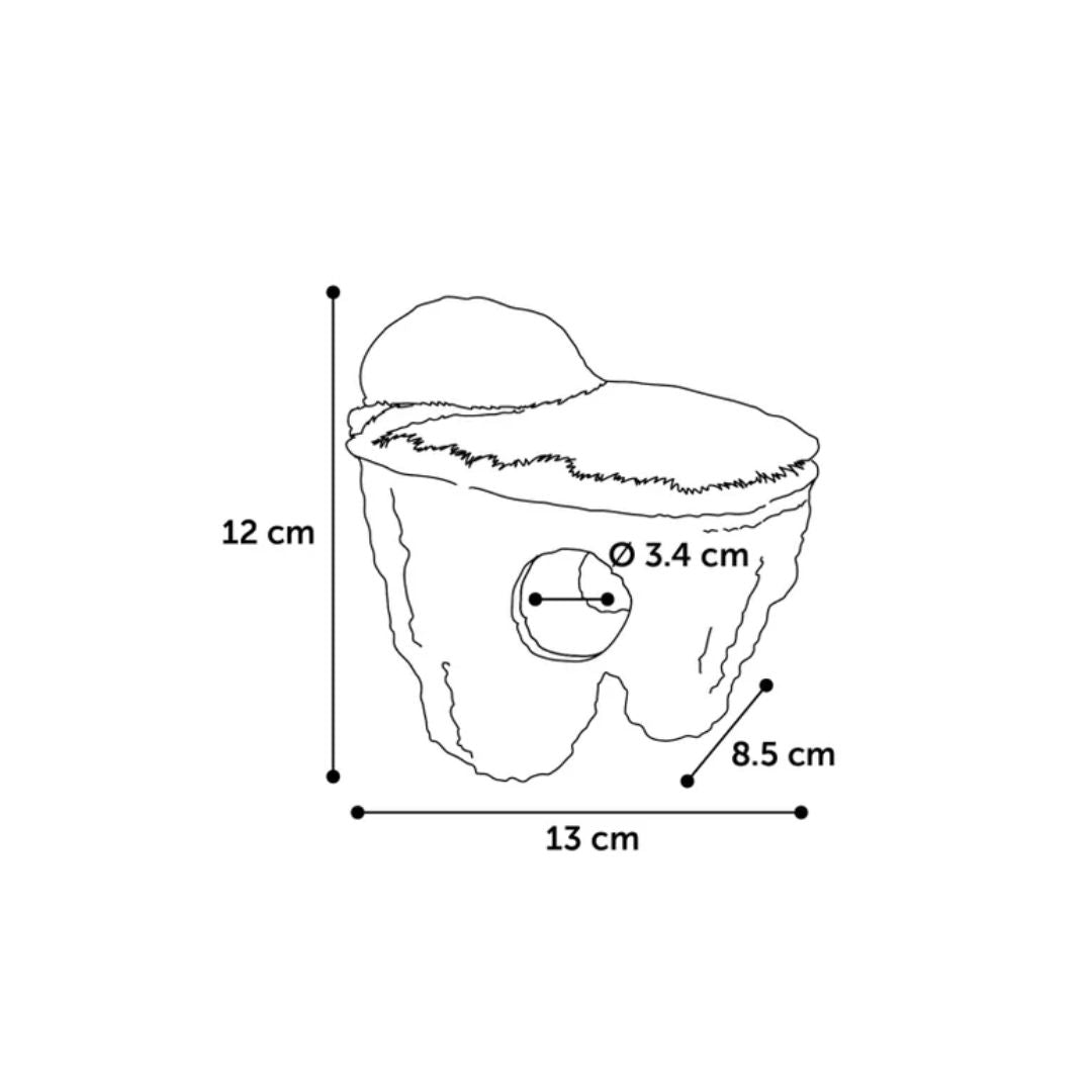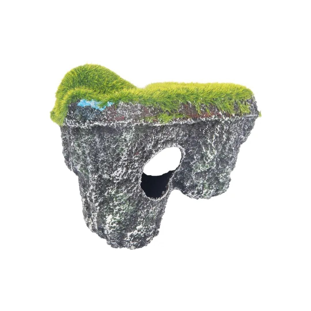 This decorative floating rock with moss provides a natural hiding place and playful structure for small fish. Made from polyresin, it stays afloat and includes openings for swimming through, adding visual interest and enrichment to your aquarium.