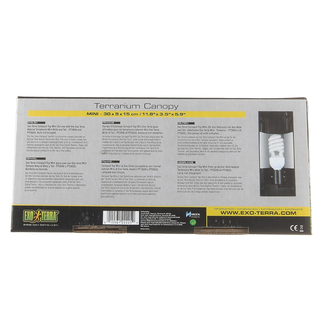 The Exo Terra Compact Terrarium Top is a versatile lighting canopy designed for small to medium terrariums. Compatible with compact fluorescent or low-wattage incandescent bulbs, it features a built-in reflector and sliding rim for mounting accessories, ensuring efficient light distribution and easy installation.